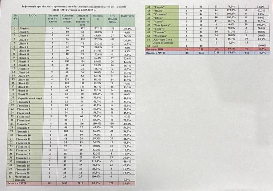 Кількість прийнятих заяв про зарахування до 1-х класів закладів загальної середньої освіти Чернівецької міської територіальної громади станом на 23.05.2025 р.
